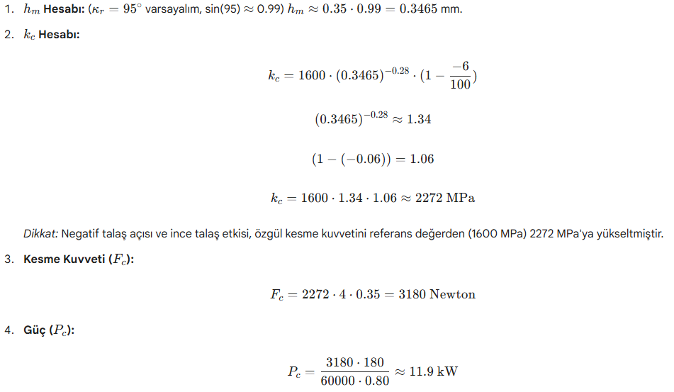 Sonuç: Bu operasyon için sürekli güç çıkışı en az 12 kW olan bir CNC torna gereklidir. Eğer atölyedeki tezgah 7.5 kW ise, ya vc 110 m/dak’ya düşürülmeli ya da paso derinliği azaltılmalıdır (fakat paso derinliği döküm kabuğu kalınlığının altına düşmemelidir).